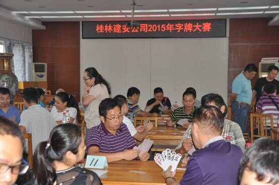 为丰富员工文化生活,庆祝国庆佳节,桂林建筑安装工程有限公司于2015年9月30日上午在公司五楼会议室开展公司字牌比赛。此次比赛以各基层工会为报名单位组队,每个基层工会选6名选手参赛,打团体赛,以参赛队6名选手总分累计,决出一、二、三名团体奖。经过比赛,市政和劳务公司联合工会、租赁分公司、直属分公司分别荣获第一、二、三名。图为比赛现场。